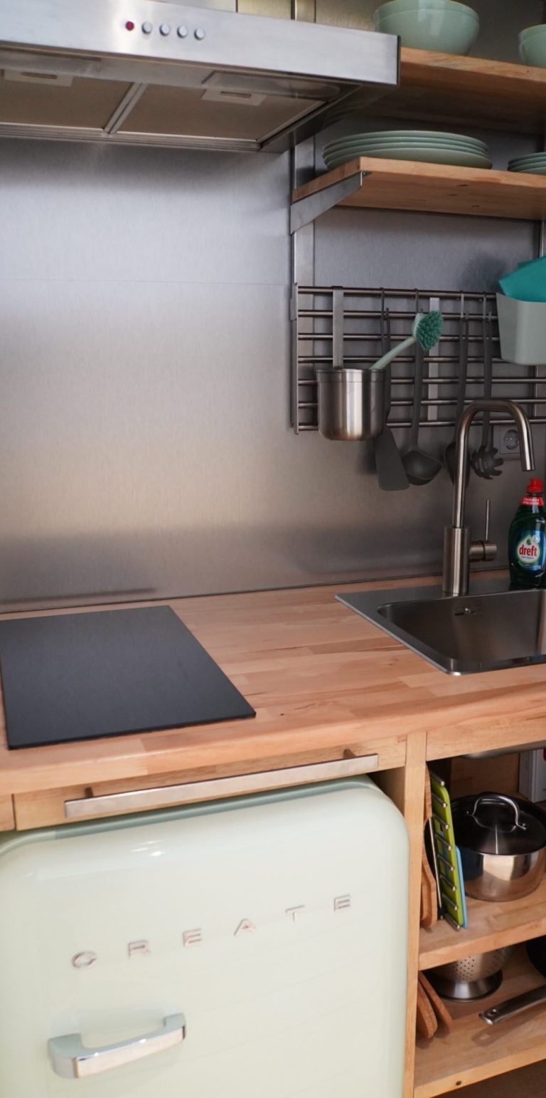 In het (mini) keukentje kunt u iets kleins bereiden. De inductiekookplaat heeft twee pitjes, er is een koelkastje en zowel de pannen als het serviesgoed en het bestek kunt u gebruiken.